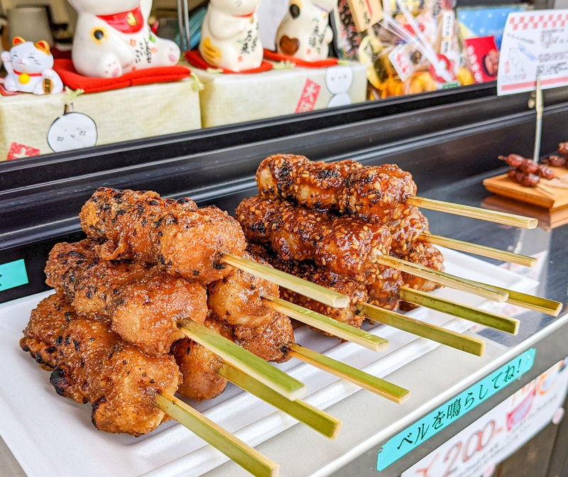 The streets are packed with delicious eats, offering everything from kushikatsu (deep-fried meat skewers) to local specialties such as Nagoya-style tebasaki (chicken wings) and gohei mochi (grilled rice cakes with a sweet and savory sauce), and more.