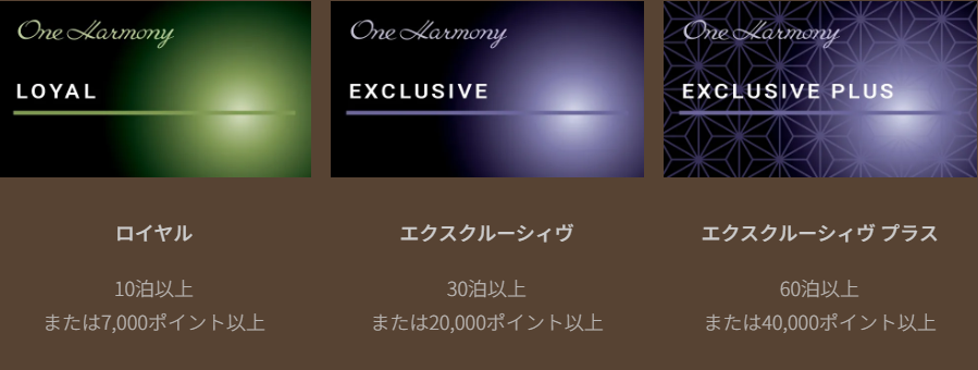 One Harmonyはオークラ ホテルズ & リゾーツ、ニッコー・ホテルズ・インターナショナル、ホテルJALシティでご利用いただける、入会金・年会費無料の会員プログラムです。